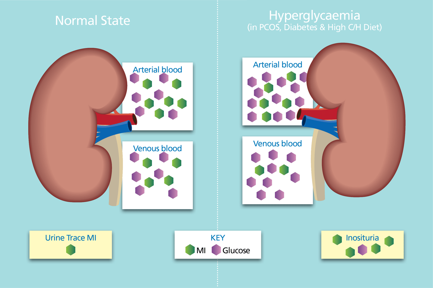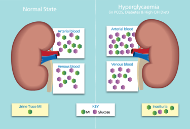 In hyperglycaemia, SMIT2s become inundated with glucose thereby reducing the reabsorption capacity of SMIT2 activity for myo-inositol reabsorption.
