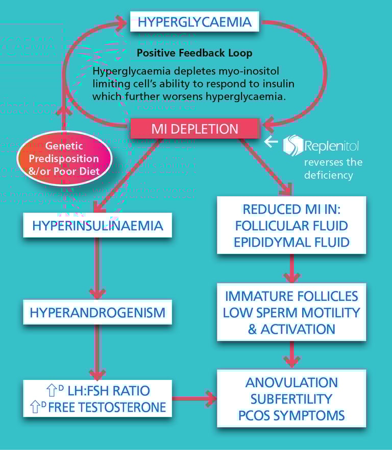 A diet with an excess of carbohydrates also produces the same effect and can, over time, lead to a deficiency of the crucial metabolite involved in insulin signalling and which is also essential for normal sperm and egg production. A deficiency can cause the disruption of normal blood sugar regulation, cholesterol and sex hormones - typically observed in PCOS and type 2 diabetes. A disturbance in the normal pathways caused by a genetic predisposition and/or high carbohydrate diet can have a profound negative impact on your fertility. Replenitol replenishes the body's access to the missing metabolite and can correct the disrupted systems, including restoration of fertility.