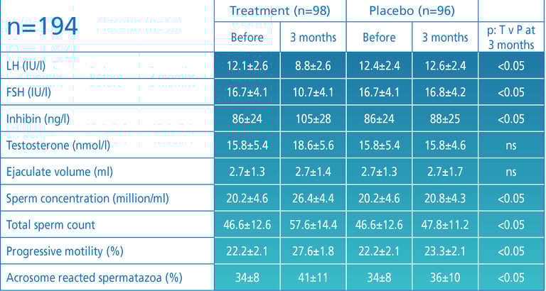 From the results above, you can see that the two "female sex hormones" luteinising hormone (LH) and follicle-stimulating hormone (FSH) are reduced by over one-third and the "male sex hormone" testosterone increases by a fifth, normalising the male hormonal profile. There are direct effects on the sperm too: concentration, sperm count, progressive motility and acrosome activation (required for the sperm to fertilise the egg) are all significantly improved, boosting the chances of achieving a successful pregnancy.