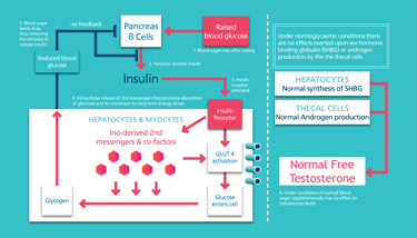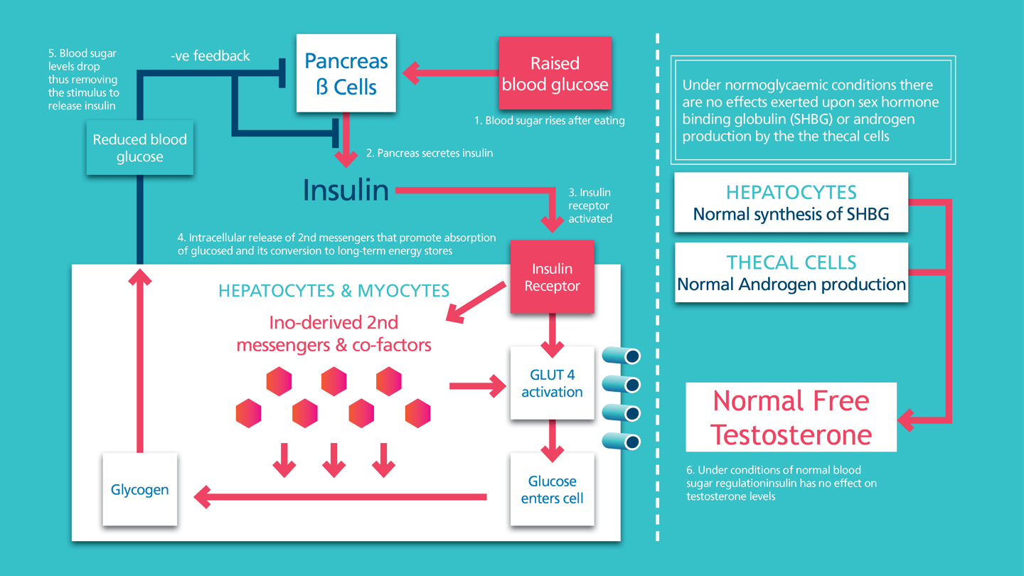 Below is a graphical representation of normal insulin signalling and blood glucose regulation. On the following page, we show how insulin resistance arises and how it disrupts other biochemical systems that lead to the symptoms associated with PCOS.