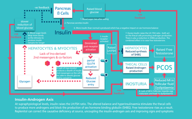 7. Linkage between the glucose-insulin system and androgen production and regulation now becomes evident. The thecal cells of the ovary are stimulated to produce more androgens and an inhibitory signal to the liver prevents the normal production of sex hormone binding globulin (SHBG) which is the means by which our bodies keep the system in balance. So there is a double whammy, whereby more androgens than normal are produced and our ability to deal with the excess is compromised.
