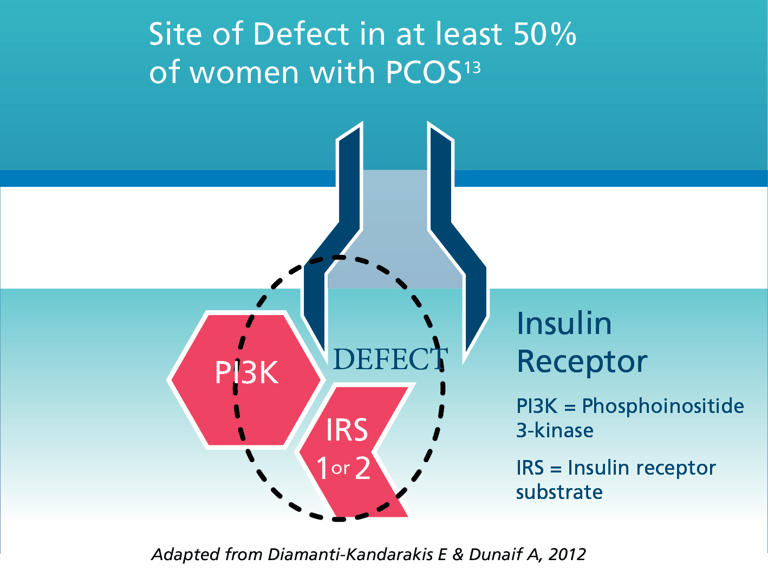 At the end of 2012, Professors Evanthia Diamanti-Kandarakis and Andrea Dunaif published a very wide-ranging review that took account of almost 600 papers on the subject matter. In their paper, they published a diagram similar to that below which identified the site of the PCOS defect in at least half of those with the syndrome. This encompasses the area around the base of the insulin receptor which is essential for the normal signal transmission from outside to inside the cell. Compensating for the defect by replacing the missing metabolites normalises glucose-insulin regulation and leads to observed clinical benefits.